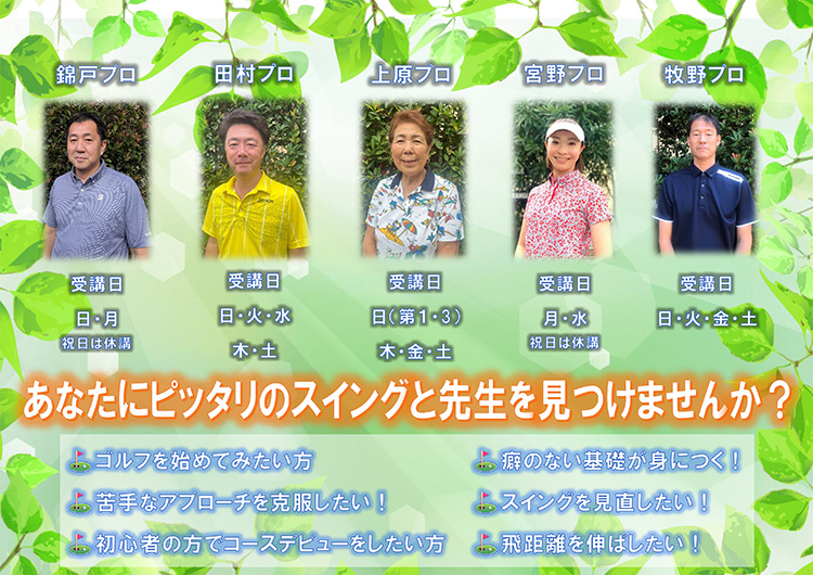 注意事項 | 「初心者専用」のため、田村プロから見て初心者以上のショットを放つ(技術のある)方は 、 次回以降正規スクール(回数券制および月謝制)をお勧めする場合があります。 |